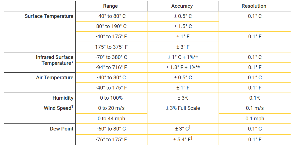 The device features fast-response precision sensors that deliver accurate and repeatable readings. New field-replaceable, pre-calibrated, and certified Relative Humidity and Air Temperature sensors minimize downtime, specifically in models PRBDPM, DPM1, and DPM3. For the PRBDPM model, the Relative Humidity and Surface Temperature sensors acclimate in half the time of previous models, reducing wait times and speeding up inspections. SmartTrend™ Indicators provide insight into whether readings are rising, falling, or stable. A Certificate of Calibration is included, demonstrating traceability to NIST, and the device conforms to national and international standards, including ISO and ASTM.