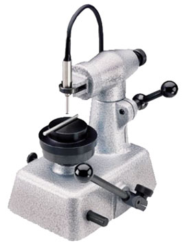 The probe is fastened securely to the fixture using a ring-clamp, and the measuring platform is raised to the probe tip using the lever on the side of the fixture. The rising motion of the platform is smooth, providing a stable method of measuring on the smallest parts.